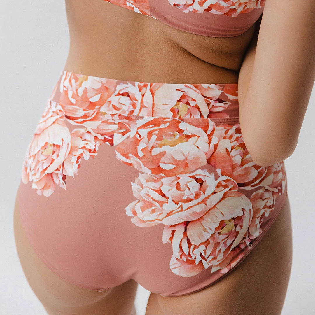 A floral high-waisted swim bottom designed to fit to your shape and flatter your figure. Our new garden rose pattern features a pink background with cream hued florals.