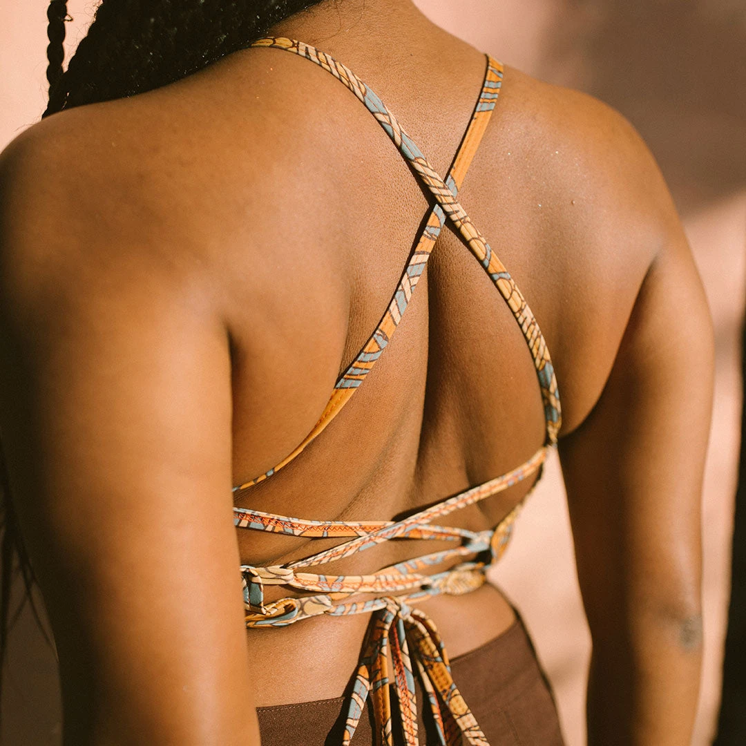 Bo-ho vibes and strappy backs for days! The high neck provides coverage and comfort and the tied-up back gets you the perfect fit every time. It’s one of our most popular bikini tops and has stood the test of time. If you’re looking for the perfect yellow hued swim suit, you’ve found her.