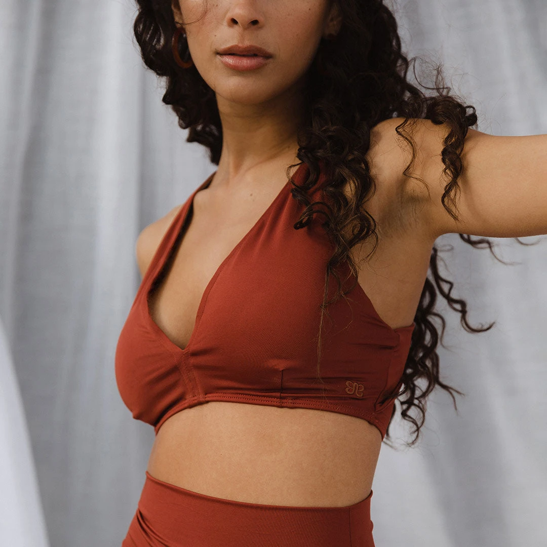 With a criss cross back and a v-neck style in front, this suit is the perfect combination of sporty and girly. Removable bust pads provide great support, and a classy cinnamon color ties it all together!
