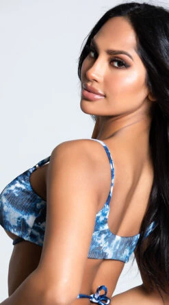 Get a taste of summer in this sexy exclusive bikini top featuring a square neckline, a tie dye print with a soft ribbed fabric, adjustable spaghetti straps, an underboob cut-out with a banded elastic hem, and a hook back closure.
